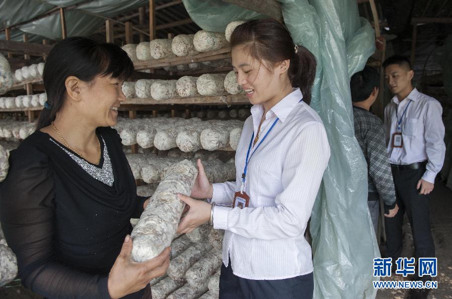 10月12日,中国邮政储蓄银行景宁畲族自治县支行工作人员张颖(左二)、梅民勇(右一),来到该县鹤溪街道三支树村金坑香菇棚,向农户柳新吉(右二)、毛英妹(左一)夫妇了解用于香菇生产的8万元“政银保”小额贴息贷款使用情况。柳新吉、毛英妹夫妇是该县英川镇温堆村的低收入创业农户,在“政银保”小额贴息贷款帮扶下,2014年已发展种植香菇四万棒。新华社发(李肃人 摄)
