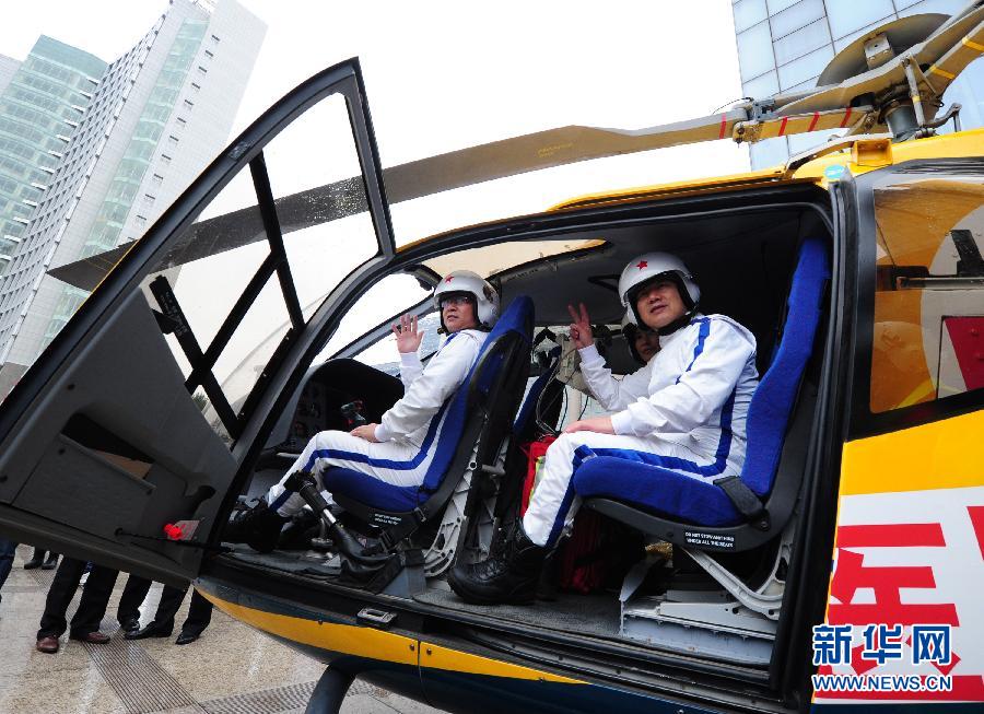 10月12日,急救飞行医疗队队员坐在医疗直升机内。 新华社记者 丁海涛摄