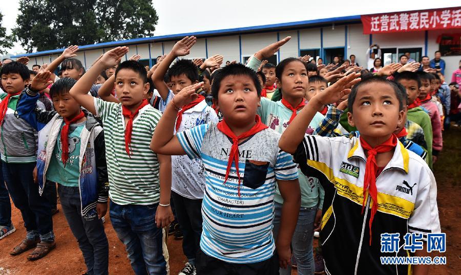 10月13日,震中永平镇迁营小学的小学生在参加复课仪式。当日,经相关部门调查评估具备复课条件的云南景谷地震灾区88所学校正式复课,占全县学校总数的88%,包括695个班级、29061名中小学生。10月7日发生的6.6级地震导致景谷县100所各级各类学校全部停课,16名师生不同程度受伤,83所学校受到不同程度的损坏。新华社记者 陈海宁 摄