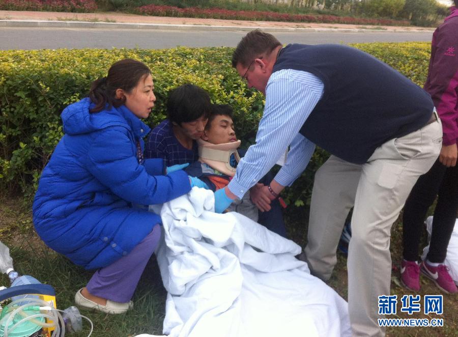 10月12日,一名外国医务人员(右一)和其他工作人员对伤者进行紧急救护。当日下午4点半左右,天津理工大学的几名大学生在天津团泊大道骑行时与一辆轿车发生事故,两名大学生受伤。天津网球公开赛组委会的医务车正好路过,车上的一名外国医务人员和其他工作人员立刻停车进行紧急救护,并将其中一名伤者送往附近医院。新华社记者岳月伟摄