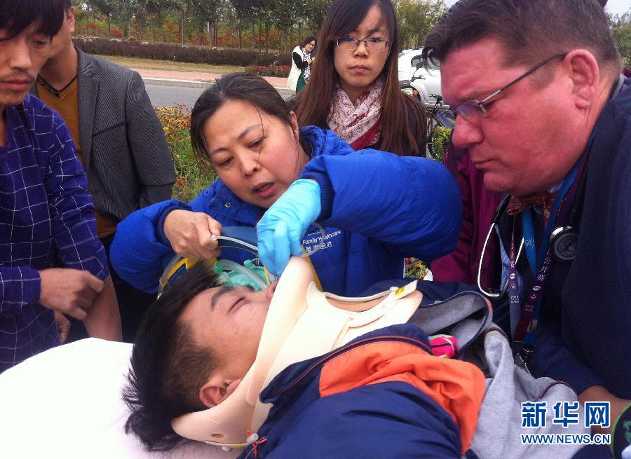 10月12日,一名外国医务人员(右一)和其他工作人员将伤者抬上担架。当日下午4点半左右,天津理工大学的几名大学生在天津团泊大道骑行时与一辆轿车发生事故,两名大学生受伤。天津网球公开赛组委会的医务车正好路过,车上的一名外国医务人员和其他工作人员立刻停车进行紧急救护,并将其中一名伤者送往附近医院。新华社记者岳月伟摄