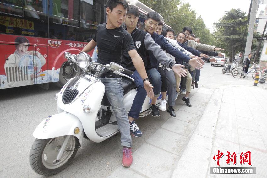 2014年10月12日,河南省郑州市政通路街头,一辆4米多长电动自行车引来围观者争抢试坐。据电动车卖家范先生称,该车总长4.7米,重400多公斤,最高时速70公里,主要用于展览,他曾经测试过,该车最多能拉动7名壮年男子,一次能坐下13人一起合影,但目前上路行驶还不被允许。范先生称,该车产自浙江,目前厂家正向吉尼斯申请“世界最长电动自行车”世界纪录,希望能早日成功。图片来源:CFP视觉中国