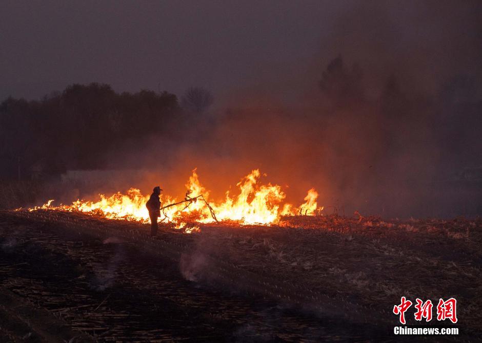 10月13日晚,在长春至吉林的高速公路旁,许多农民正在田间“烧荒”,导致高速公路烟霾严重,视线不佳。在2013年10月,吉林省曾遭遇史上罕见的严重雾霾天气,而城市周边不同程度焚烧秸秆的现象,曾被视为雾霾天气形成的原因之一。中新社发 蒋盛松 摄
