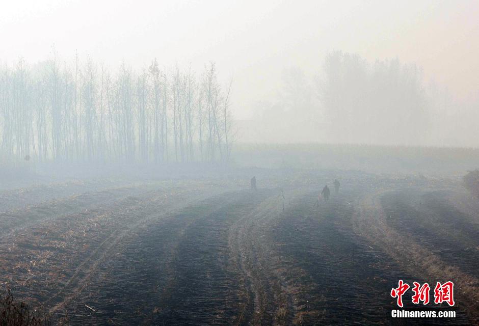10月13日晚,在长春至吉林的高速公路旁,许多农民正在田间“烧荒”,导致高速公路烟霾严重,视线不佳。在2013年10月,吉林省曾遭遇史上罕见的严重雾霾天气,而城市周边不同程度焚烧秸秆的现象,曾被视为雾霾天气形成的原因之一。中新社发 蒋盛松 摄