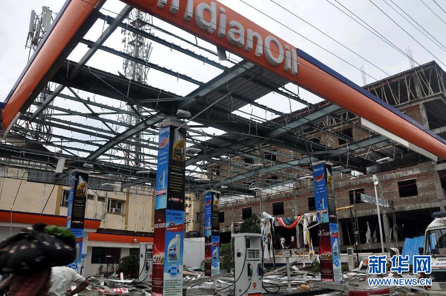 这是10月13日在印度维瑟克伯德讷姆一加油站拍摄的强旋风“胡德胡德”造成的损坏。强旋风“胡德胡德”12日在印度东南部沿海地区登陆,至13日已造成至少24人死亡。 新华社发