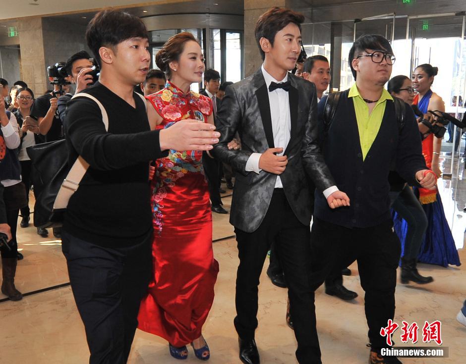 10月14日,山西太原,韩国女星蔡琳身着中式传统龙凤旗袍与内地男演员高梓淇举办婚礼,婚礼仅邀请了家人和少数朋友,但还是吸引了众多影迷前来围观。韩国女星蔡琳与高梓淇2014年3月高调公开恋情,两人在拍摄《李家大院》时相识。2011年,高梓淇参演琼瑶剧《新还珠格格》饰演箫剑,为大众所熟知。中新社发 韦亮 摄