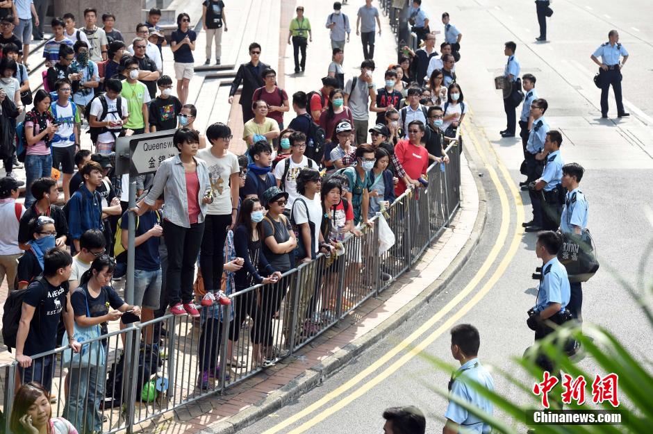 10月14日上午,大批香港警察采取清障行动。图为清除金钟道与红棉道路口非法搭建的路障。当日,“占领中环”非法集会进入第十七日,警方表示如楼宇遇到火警,这些路段则不能迅速到达。香港中通社图片中新社发 张宇 摄