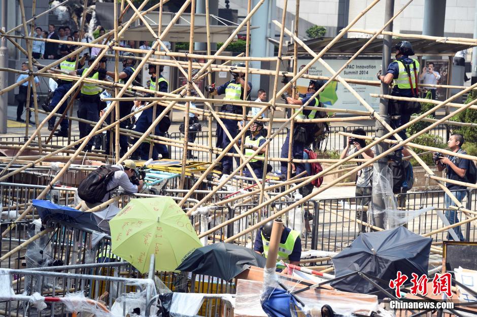 10月13日晚,香港“占领中环”非法集会者搭建五米高的竹棚架阻路,警方表示如楼宇遇到火警,消防车在这些路段不能迅速到达。14日上午警方清除金钟道与红棉道路口非法搭建的路障。香港中通社图片中新社发 张宇 摄