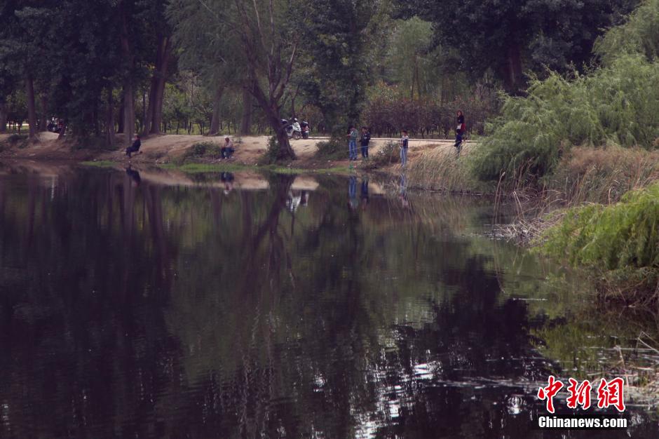 郑州西流湖南区一处水域墨绿色湖水边,几名垂钓者在耐心的等候。 陈巍高 摄