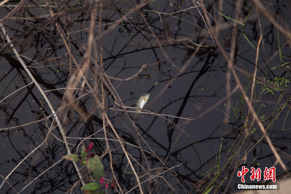 郑州西流湖南区一处水域,墨绿色的湖水散发着恶臭漂着零星的死鱼。陈巍高 摄