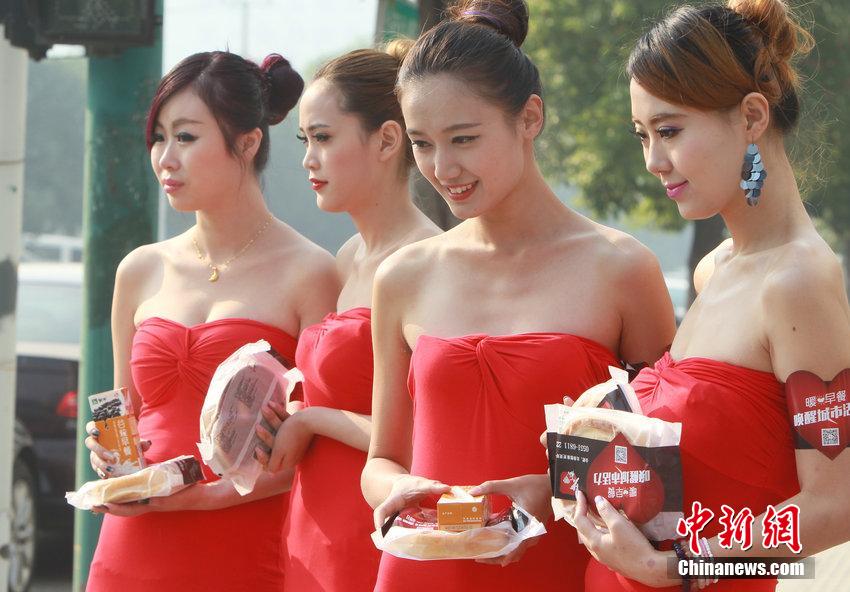 2014年10月14日,合肥一商家组织6辆保时捷轿车带着6位身穿超短裙的时尚美女和千份早餐,到各大写字楼、商圈,给正在上班的市民免费发放早餐,吸引了众多市民的关注。一些都市白领还纷纷拿出手机扫描二维码,分享到朋友圈,希望第二天跟朋友一起来领早餐。图片来源:CFP视觉中国