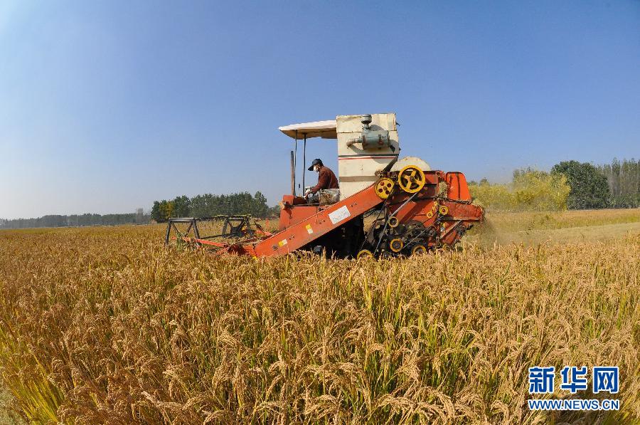 10月15日,收割机在东海县农业综合开发项目区收获“地理稻”。江苏省东海县多年来开展良种选优、产品选强等农业科研和实践活动,采用纱网覆盖、沼肥铺底和沼液灌溉的无公害管理措施,提升国家地理标志产品东海大米的品质。目前,当地东海“地理稻”进入收获期,开始收割。新华社发(张正友 摄)