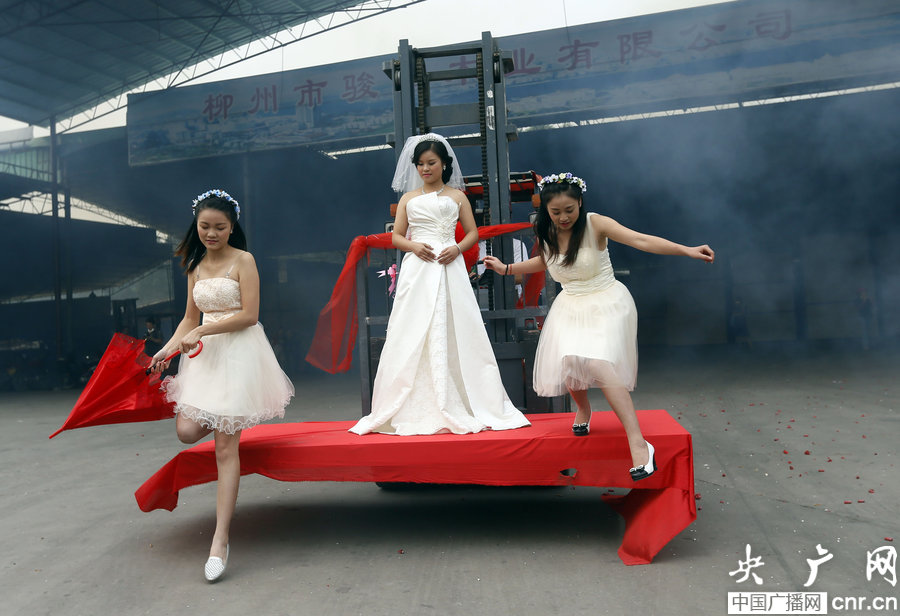 2014年10月14日,广西柳州,木业厂老板用“叉车送亲”的方式为新人送祝福。 在伴娘的陪伴下,新娘走出工厂。