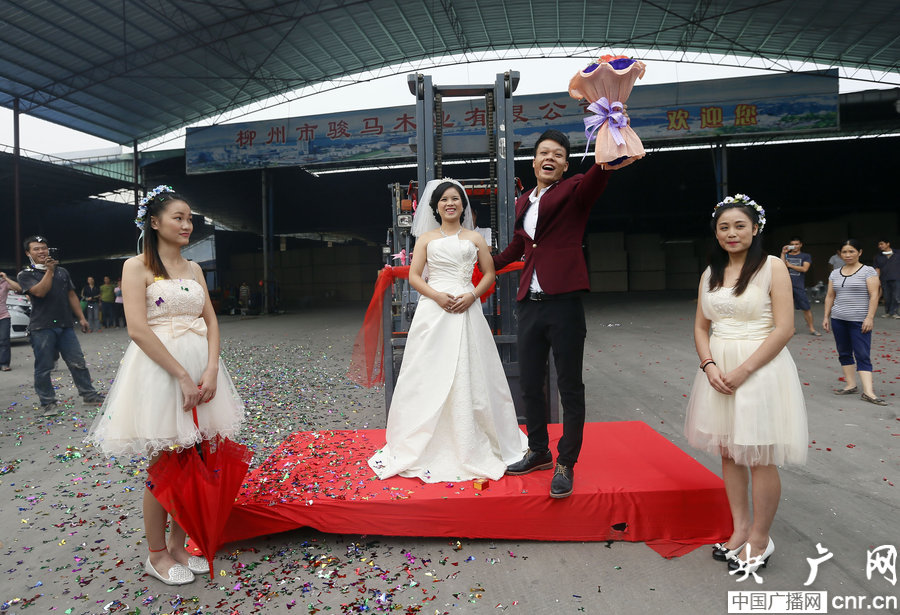 2014年10月14日,广西柳州,木业厂老板用“叉车送亲”的方式为新人送祝福。 新郎、新娘站在叉车上。