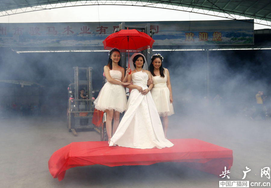2014年10月14日,广西柳州,木业厂老板用“叉车送亲”的方式为新人送祝福。 新娘站在叉车上。