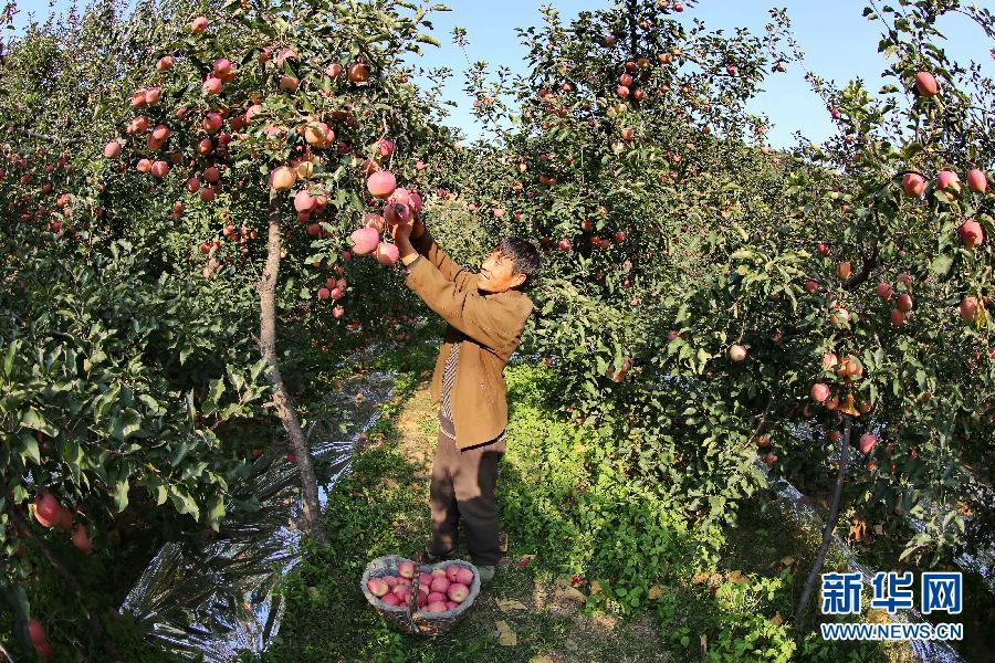 10月14日,昌黎县长峪山村果农曹东伟在自家苹果园内采摘苹果。近年来,地处燕山脚下的河北省昌黎县政府通过引导山区农民种植果树、推广无公害果品、完善果品加工产业链等方式,有效推进全县的果品生产,带动农民增收致富。据了解,目前该县共有苹果、葡萄、梨等果树13万亩,年产果品20万吨,年产值达7亿元。新华社记者 杨世尧 摄