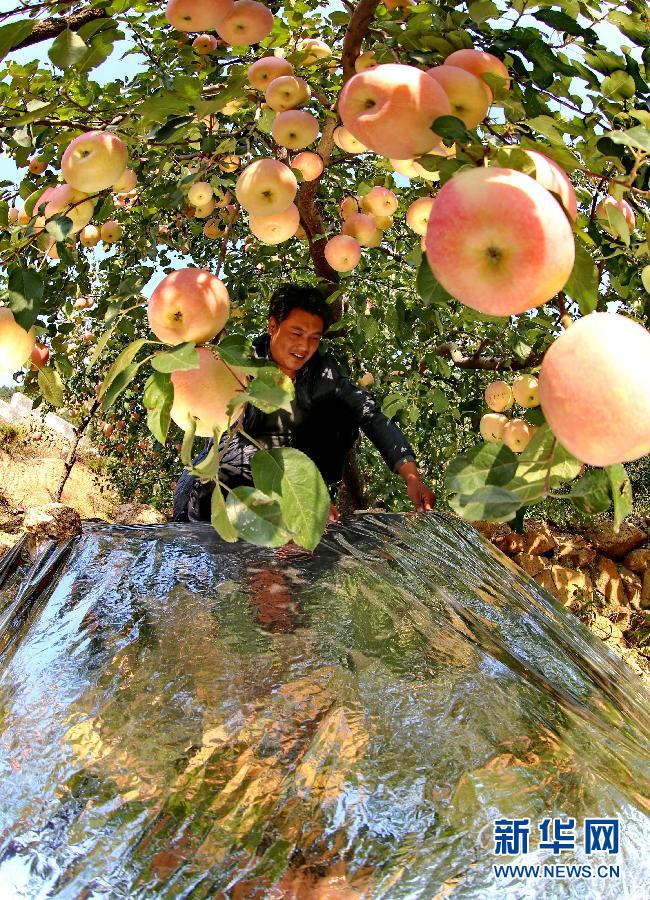 10月14日,昌黎县长峪山村的一位果农在自家园内铺反光膜以增强苹果的光照度。近年来,地处燕山脚下的河北省昌黎县政府通过引导山区农民种植果树、推广无公害果品、完善果品加工产业链等方式,有效推进全县的果品生产,带动农民增收致富。据了解,目前该县共有苹果、葡萄、梨等果树13万亩,年产果品20万吨,年产值达7亿元。新华社记者 杨世尧 摄