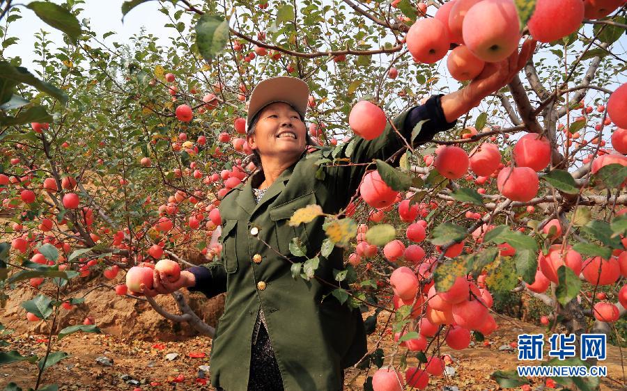 榆林市绥德县闫家渠村霍秀莲在果园里采摘成熟的苹果(10月13日摄)。陕西榆林市绥德县义合镇闫家渠村种植苹果已有近50年历史,因技术管理差,苹果产业一直难以成为主导产业。2008年以来,该村组建苹果合作社,种植优良品种,聘请果树专家进行科学管理。目前全村苹果种植面积发展到1700亩,今年产量达200多万公斤,人均可增收800多元。新华社发(郝国安 摄)