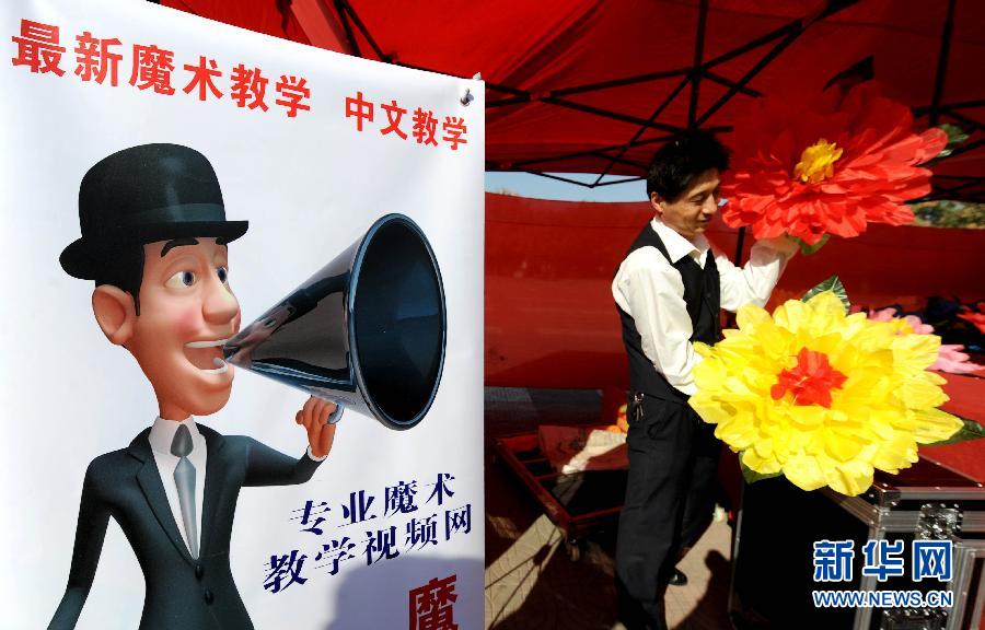 10月15日,一位从事魔术教育培训的魔术师在向群众介绍魔术道具。当日,中国·宝丰第六届魔术文化节云集了数十家来自全国各地的魔术道具展销商。据了解,2013年,河南宝丰县魔术产业创收近4.22亿元。新华社记者李安摄