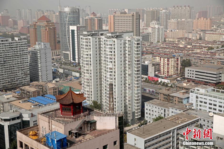 10月15日,山西太原,一座高层大厦的楼顶上建有一座古典建筑,朱红色外墙、金黄色琉璃的仿古建筑在城市现代建筑群当中格外醒目。中新社发 武俊杰 摄