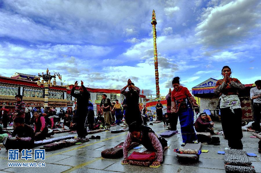 10月14日,众多信众在大昭寺外磕长头。大昭寺位于拉萨市八廓街中心,距今已有1300多年的历史,是按照藏传佛教的理想世界“坛城”修建的。大昭寺在藏传佛教中拥有至高无上的地位,藏族群众中流传着“先有大昭寺,后有拉萨城”的说法。寺前终日香火缭绕,每天到这里朝拜的信徒络绎不绝。新华社记者 张国俊 摄