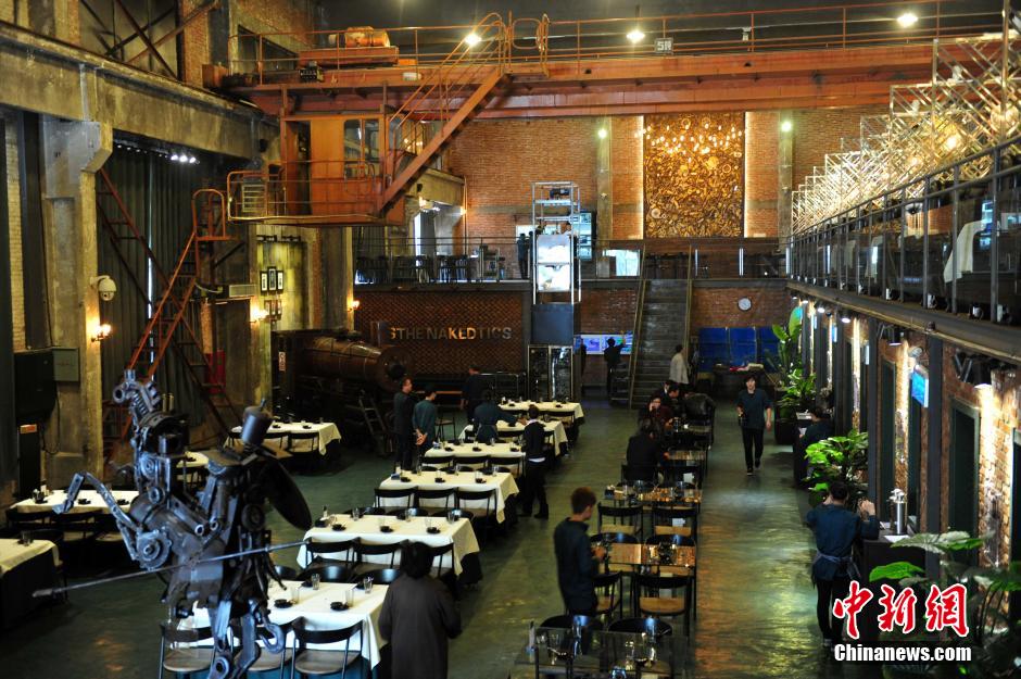 10月15日,河北石家庄“工厂”主题概念餐厅内。据了解,这间由旧车间改造的主题概念餐厅,里里外外都与铁密不可分。门口是用几个锅炉和制作而成的水景观——暖流,饭桌旁手工铁制的火车头、古代骑士等铁艺术品,盛菜的餐具也是用铁锹做的,“铁元素”在这里无处不在。 中新社发 翟羽佳 摄