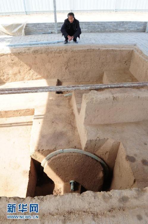 这套四马驾辕的“青铜车”,是考古人员在20世纪70年代考古发掘的著名凤雏基址南边100余米处意外钻探发现的。目前考古清理工作已发掘至车马坑60厘米处,青铜质地的车辖、车輨、车軎等相继露出,给世人初步展现出西周“第一豪车”的气势。图为考古人员在宝鸡市岐山县贺家村附近发现的车马坑(10月14日摄)。