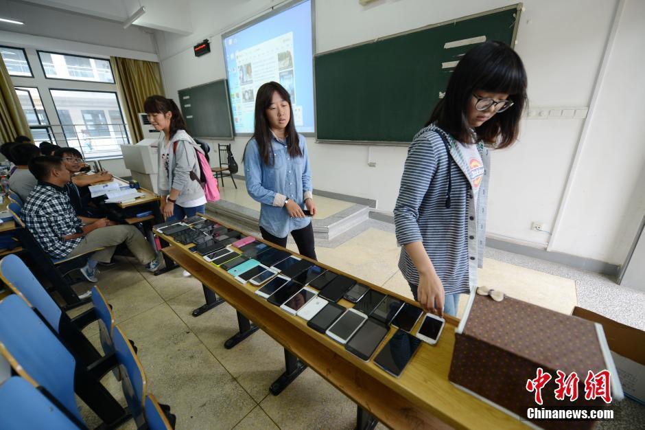 10月16日,中南大学软件学院的教室里,第一排座位上摆满了手机。为了治上课“低头族”,中南大学软件学院倡议学生先交手机再上课,此举得到众多师生的认可。杨华峰 摄