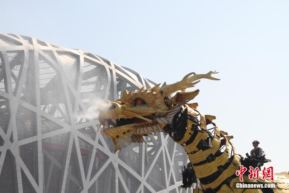 10月17日,为纪念中法建交50周年,北京国家体育场“鸟巢”上演神兽“龙马”“蜘蛛”大巡演活动。活动分为三天,八幕展开,每一幕表演1.5小时。第一天为“苏醒”,龙马和巨型蜘蛛分别现身;第二天为“对抗”,龙马寻找蜘蛛,蜘蛛为龙马布下陷阱,两个神兽激战;第三天为“和解”,龙马救出了深陷自己布下陷阱的蜘蛛,蜘蛛被感化成为龙马的朋友,大地恢复平衡。“龙马”大型机械装置是取自中国成语“龙马精神”的神兽,“龙马”运用了中国文化元素,根据中国古代传说故事演绎创作。“龙头马身”的“龙马”大型机械装置长17米,马背置亭高度15米,展开的翅膀宽度16米,重47吨,使用最先进的自动化控制系统和电子设备控制,它可以行走、腾跃。“蜘蛛”高5.7米,宽6米,重37吨,行进时高度13米,身体完全展开的跨度达20米。 中新社发 刘宪国 摄