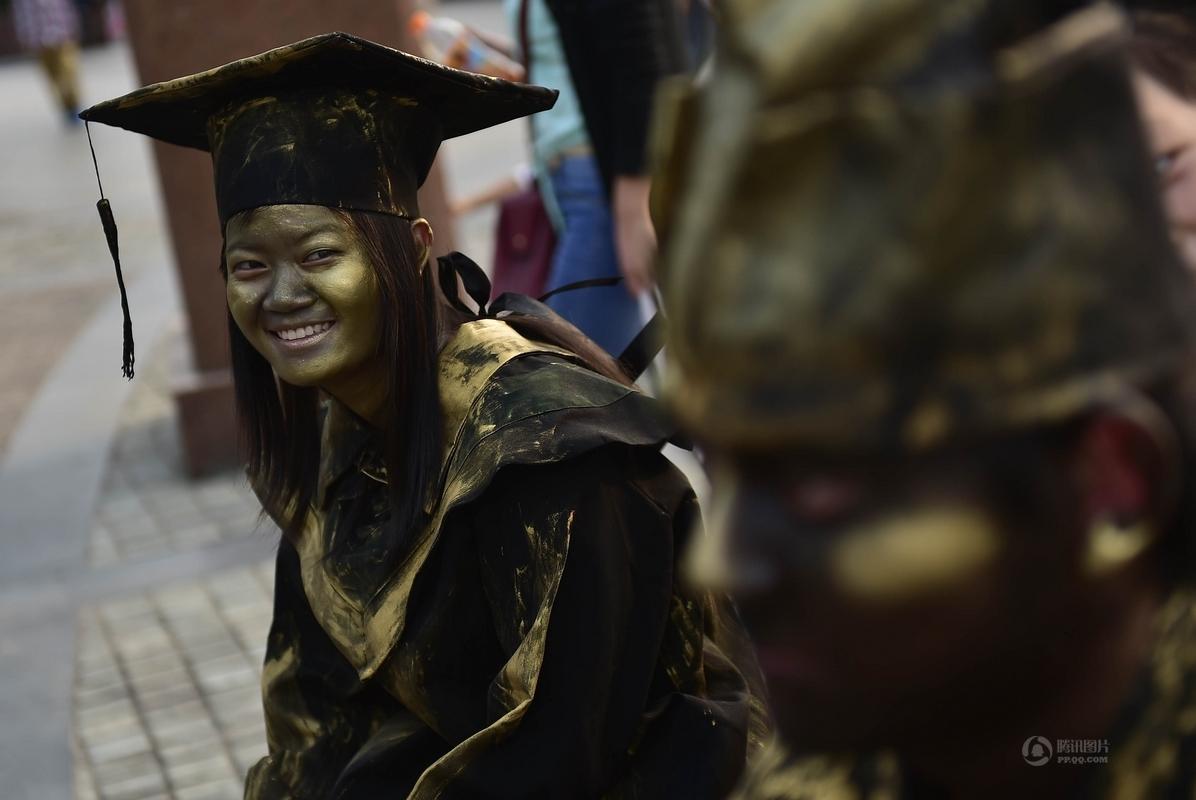 2014年10月19日,在武汉光谷名人林里,四位铜人身着现代学士服和古装,引来众多路人围观。 据悉这四位扮演者都是在校大学生,他们希望通过这样的行为倡导“读书有大用”,激发社会对于读书和知识的重视。(本组摄影:王翮)