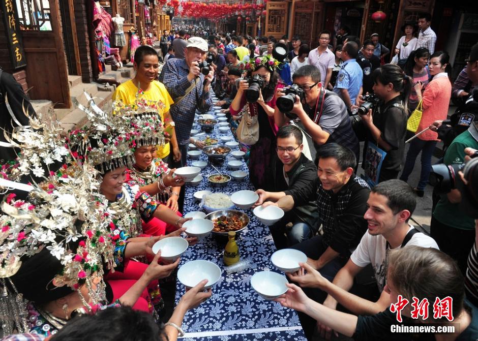 10月19日,近千米长桌、几百副碗筷、各色特色美食……经工作人员几个小时准备,近千米的“苗家长龙宴”在中国最美小城凤凰古城内热闹开场,迎接四方前来的游客。图为苗家人迎接前来游客。 田儒军 摄