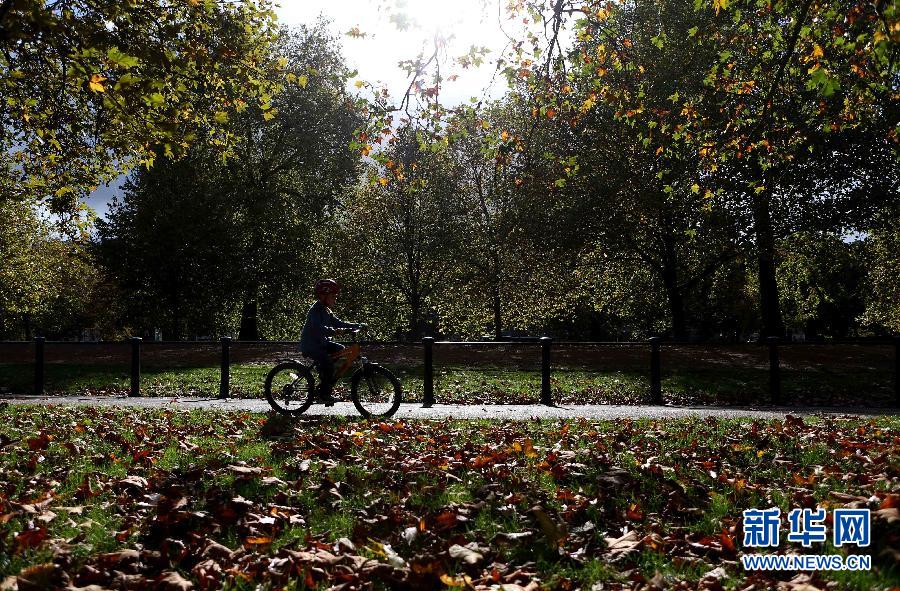 10月19日,在英国伦敦,一名小男孩在小路上骑自行车。连日的阴雨天气过后,周日的伦敦天气晴好,秋意渐浓。 新华社记者韩岩摄