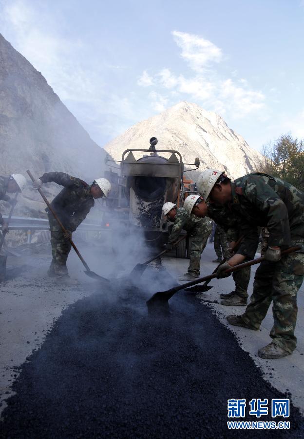 武警交通二支队官兵在国道318线川藏公路上的险途“怒江72道拐”路段铺设沥青修复破损路面(10月19日摄)。目前,正值川藏公路塌方、滚石、干塌、路基垮塌等灾害多发季节。10月18日下午“怒江72道拐”多处不同程度发生干塌灾害,部分路面遭到破坏。负责这一路段养护的武警交通二支队官兵迅速赶到现场,清理山石并铺设沥青修复路面。据介绍,武警交通二支队驻守在川藏公路沿线,主要担负海拔最高、灾害最频繁、路况最险的800公里路段养护保通任务,养护管理路段跨越金沙江、澜沧江、怒江、帕隆藏布江等4大水系,翻越宗拉山、拉乌山、东达山等6座雪山,年平均各类自然灾害多达300多次,被称之为“世界公路病害百科全书”。多年来,武警交通二支队官兵用青春、汗水,乃至生命诠释着“一不怕苦、二不怕死”的“两路”精神,使川藏公路通车时间由1996年以前的不足半年,达到了现在的11个月以上,行车时速平均提高了40倍,创造了连续17年冬季无断通的奇迹。新华社记者 潘旭 摄