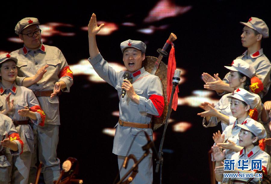 于都本地的“长征源”合唱团在于都县体育中心演唱《长征组歌》,该节目现已成为于都红色旅游的一张名片(10月17日摄)。近年来,江西省通过大力发展于都、瑞金两处长征出发地的红色旅游,有效带动革命老区经济创收。据两地旅游局统计,2014年前三季度,于都旅游总接待人数109万人次,旅游收入8.86亿元;瑞金旅游总接待人数375.2万人次,旅游收入12.2亿元。新华社记者陈子夏摄