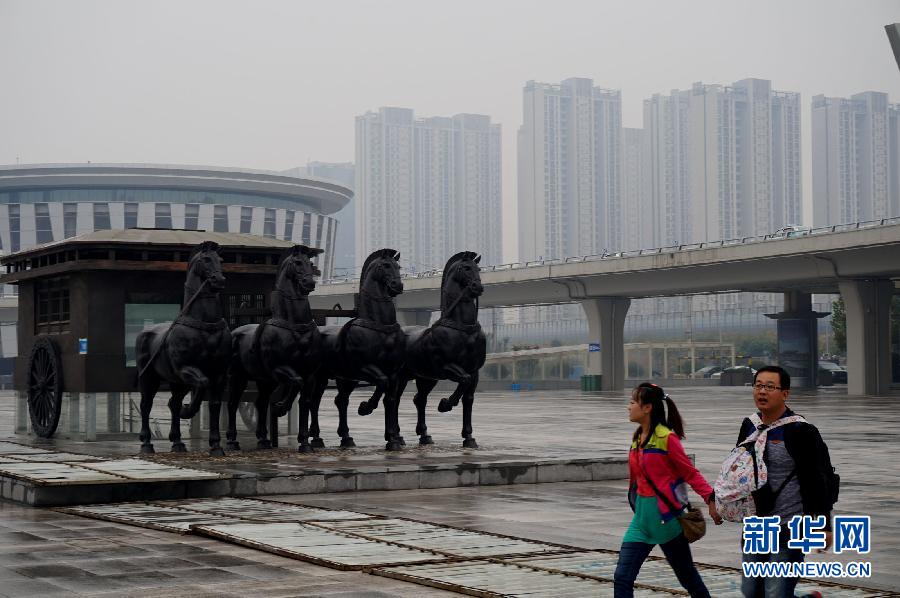 10月19日,两位乘客走在济南高铁车站广场上。 10月20日,山东气象台发布大雾黄色预警信号,鲁西南、鲁西北和鲁中的北部地区出现了能见度小于500米的浓雾,其中聊城和菏泽的部分地区能见度小于200米。受北方大面积雾霾天气的影响,山东地区近日持续雾霾。新华社记者 冯杰 摄