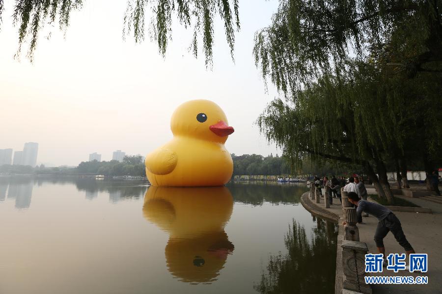 10月20日,“大黄鸭”漂浮在南京莫愁湖上。当日,由荷兰艺术家霍夫曼设计的正版“大黄鸭”亮相南京莫愁湖,与游人见面。 新华社发(王新 摄)