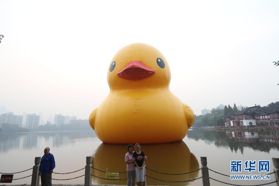10月20日,南京市民与“大黄鸭”合影。当日,由荷兰艺术家霍夫曼设计的正版“大黄鸭”亮相南京莫愁湖,与游人见面。 新华社发(王新 摄)