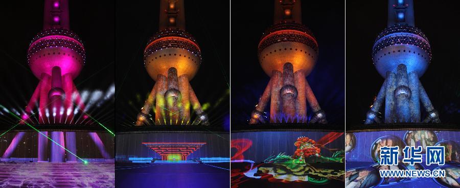 这是灯光秀现场(拼版照片,10月19日摄)。近日,大型多媒体影像艺术灯光秀《东方之光》亮相上海东方明珠城市广场,向观众免费开放。表演分为序、城市之光、艺术之光、梦想之光四大版块,凸显对于中国梦的美好憧憬。新华社记者 裴鑫 摄