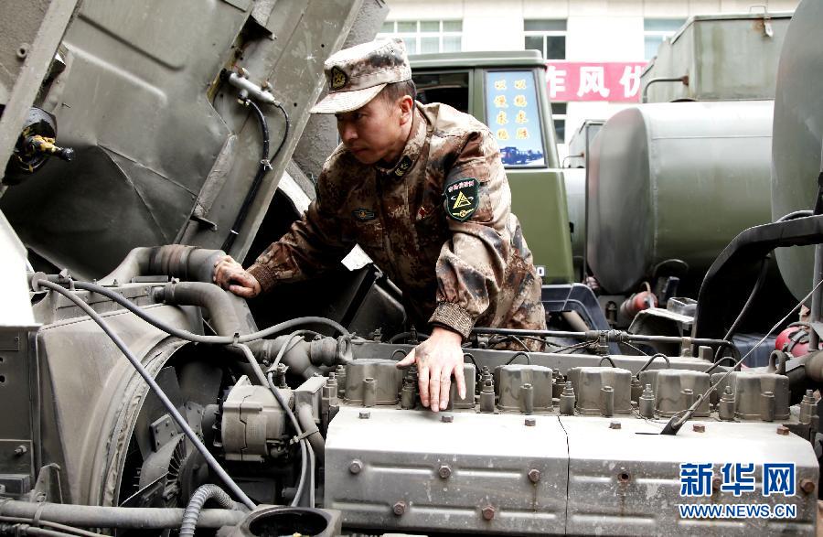 川藏兵站部某兵站的官兵在检修汽车(10月15日摄)。成都军区联勤部川藏兵站部副部长王玉庆在接受新华社记者采访时表示,作为一名在川藏兵站部服役36年的老兵,有幸见证了进藏运输发生的四个可喜变化:一是路况越来越好;二是装备越来越好;三是食宿越来越好;四是安全形势越来越好。 新华社记者 潘旭 摄