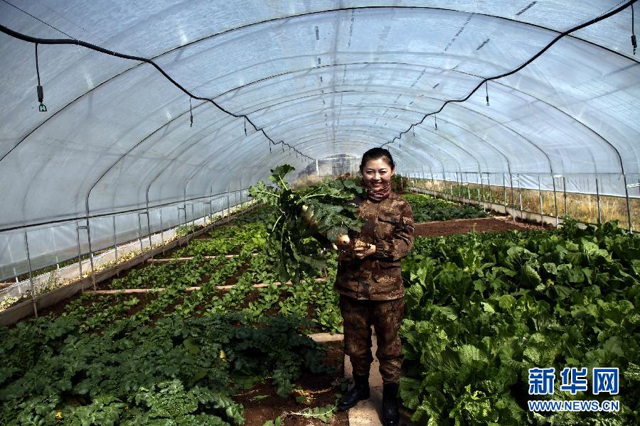 川藏兵站部某兵站的一名女兵在兵站自建的蔬菜大棚内收获战士们种植的大萝卜(10月18日摄)。成都军区联勤部川藏兵站部副部长王玉庆在接受新华社记者采访时表示,作为一名在川藏兵站部服役36年的老兵,有幸见证了进藏运输发生的四个可喜变化:一是路况越来越好;二是装备越来越好;三是食宿越来越好;四是安全形势越来越好。 新华社记者 潘旭 摄