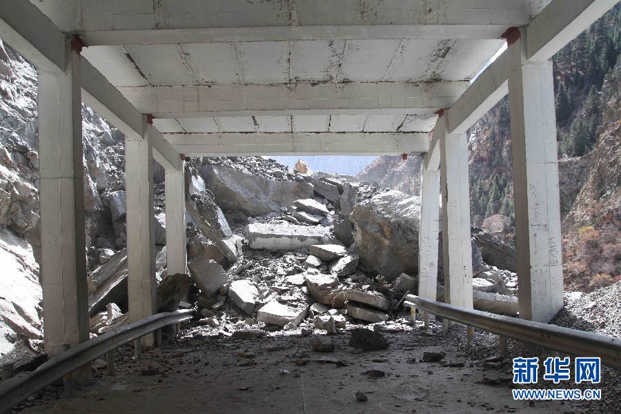 10月19日,武警交通二支队官兵已成功将被损坏的防雪走廊坍塌顶盖破除,但坍塌堆积物仍然封堵着整个防雪走廊。因突发山体塌方导致交通中断的川藏公路然乌沟路段,经过武警交通二支队官兵连续20余小时奋战,现已成功将被损坏的防雪走廊坍塌顶盖破拆,但坍塌堆积物仍然封堵着整个防雪走廊,目前官兵正全力清理坍塌物。新华社发(刘兴勇 摄)