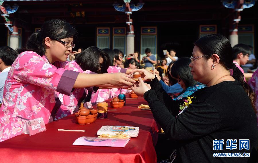 10月19日,在台北孔庙举行的成年礼上,青年们亲手奉茶敬父母。当日,“2014年台北市联合成年礼”仪式在台北市孔庙大成殿广场举行。青年们亲手向父母亲人奉上暖茶,感谢他们的养育之恩,同时以传统儒家古礼敬拜先师孔子。新华社记者 王庆钦 摄