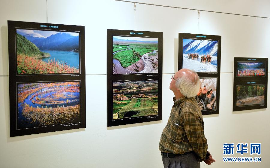 10月19日,观众参观摄影展。当日,由中华文化发展促进会、新疆摄影家协会和中华艺术摄影家学会、台湾摄影学会联合主办的“西部明珠大美新疆”摄影展在台北拉开帷幕,展出100余幅反映新疆壮丽自然风光、多元历史文化、浓郁民族风情以及经济建设成就和各民族和谐共处、安居乐业的摄影作品。新华社记者王庆钦 摄