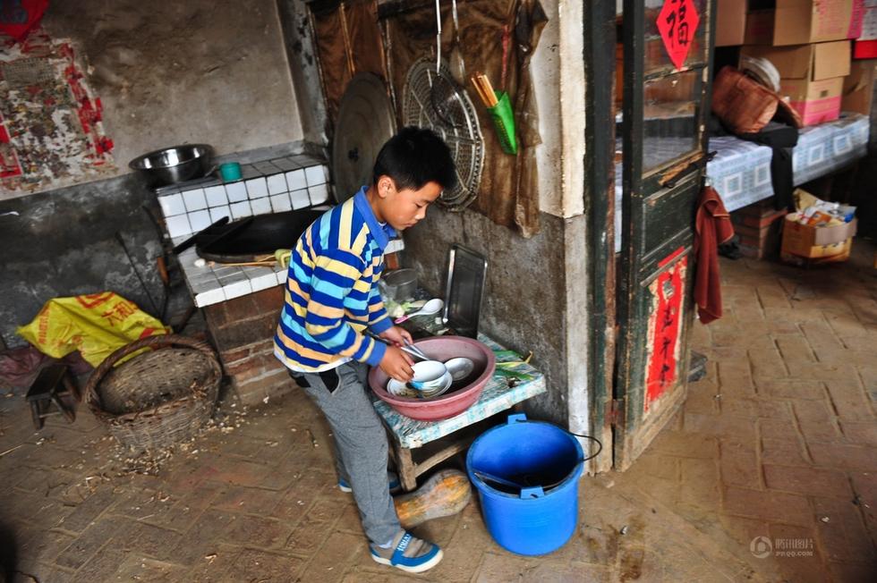 王荣妈妈吃完饭,王荣把碗拿到厨房去洗,这些活没人教王荣,现在他只能模仿父亲的动作来做。