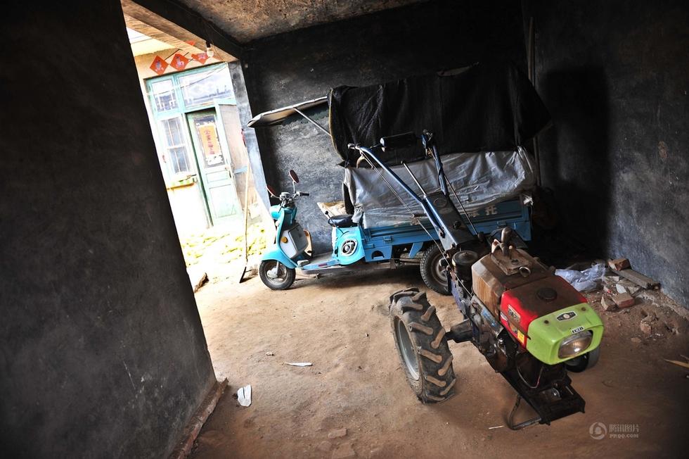 由于常年卧床,何晶明食道和胃已经非常差,吃饭也很慢,随时可能还会呕吐。每次喂饭前王荣都会先自己尝一下饭的温度,然后提前凉好一杯水,一口饭一口水,一顿饭大约需要半个小时左右时间。由于王荣不会做饭,母亲吃的都是爷爷家做的,或者去村里超市买一点。图为从家中的农机具可以看出,这个家庭刚刚变故不久。
