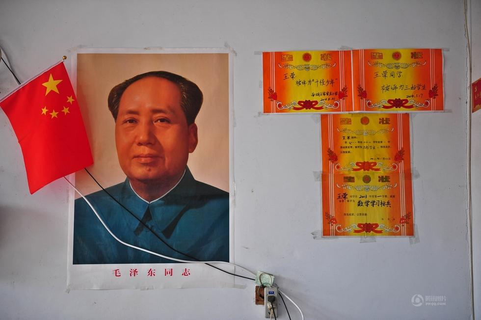 对王荣来说最难的就是给母亲翻身了,由于年龄太小体力差,每次翻身对他来说都像一场战役。他站在床上,先把母亲的双腿翻过来,然后在母亲的配合下抱着母亲的上身一点点挪动。记者看到,每次给母亲翻完身后,王荣都会长时间的揉自己的手腕,“他对我说过疼,但没办法,只能让他照顾我。”何晶明说。图为王荣家墙上的奖状讲述着他成绩的优秀,如今班级前三名的他因为家庭的变故已经辍学在家,但他依然渴望学习。