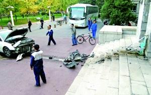 北京晨报记者赶到现场看到,轿车停在教学楼前的台阶下,车头已严重变形,驾驶轿车的老师不知去向,学校保卫处的工作人员在周围拉起警戒线,不少围观学生在旁照相。地上近十米长的刹车痕仍清晰可见,一直延伸至教学楼前的台阶下。台阶上的柱子有明显被撞击过的痕迹,碎玻璃渣、车头碎片散落一地,现场周围仍残留不少油迹,目击同学表示,是轿车撞击柱子后泄漏的。