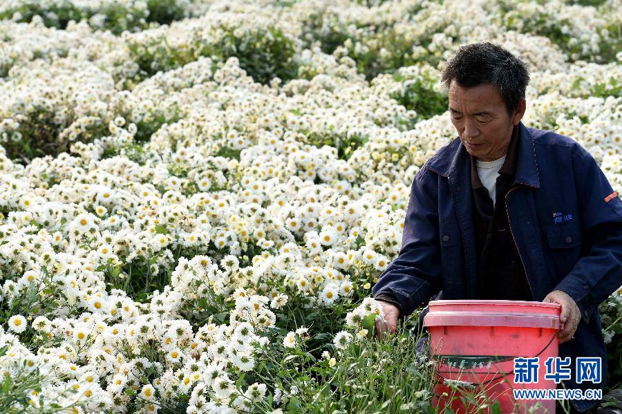 10月22日,安徽省亳州市谯城区十九里镇马寨村农民在田间采摘杭白菊。连日来,在安徽省亳州市谯城区十九里镇马寨村千亩菊花种植基地,菊农们抓住晴好天气抢收菊花。据菊农介绍,今年菊花喜获丰收,平均亩产干菊花160公斤以上,菊花远销江苏、浙江、上海、广州等地,每亩可为菊农带来数千元的经济收入,菊花种植已经成为当地农民增收致富的主要产业之一。新华社发(刘勤利 摄)
