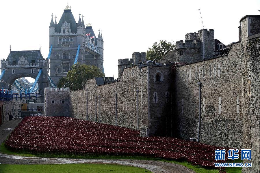 这是10月22日在英国伦敦的伦敦塔拍摄的陶瓷罂粟花。由888246朵陶瓷制作的深红色罂粟花组成的装置艺术品在英国伦敦塔下展出,以此悼念第一次世界大战期间为英国战死的888246名战士。新华社记者韩岩摄