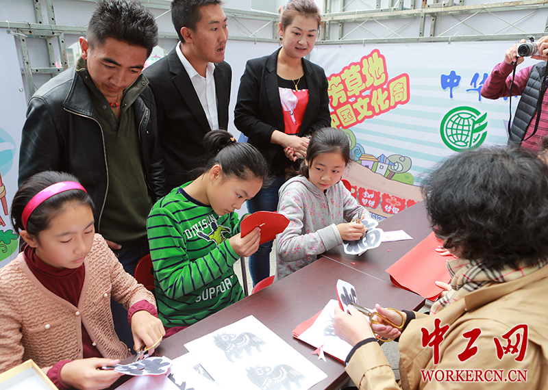 学生跟着老师傅们学习剪纸技艺。